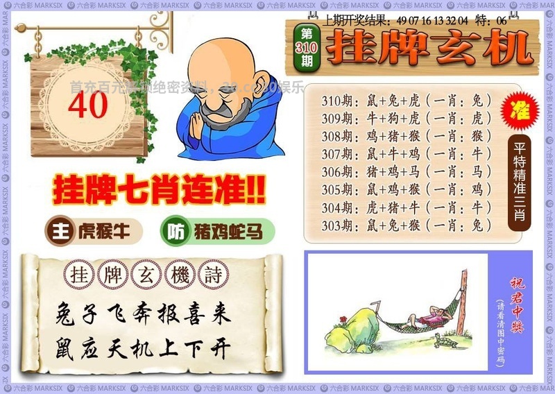 | 300期七肖 | 鼠龙鸡虎马羊狗 | 开:虎40 |